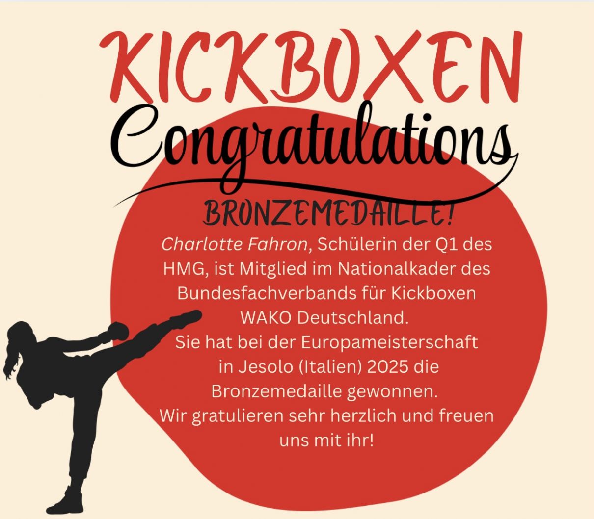 Charlotte Fahron, Schülerin der Q1 des HMG, ist Mitglied im Nationalkader des Bundesfachverbands für Kickboxen WAKO Deutschland. Sie hat bei der Europameisterschaft in Jesolo(Italien) 2025 die Bronzemedaille gewonnen. Wir gratulieren sehr herzlich uns freuen uns mit ihr!