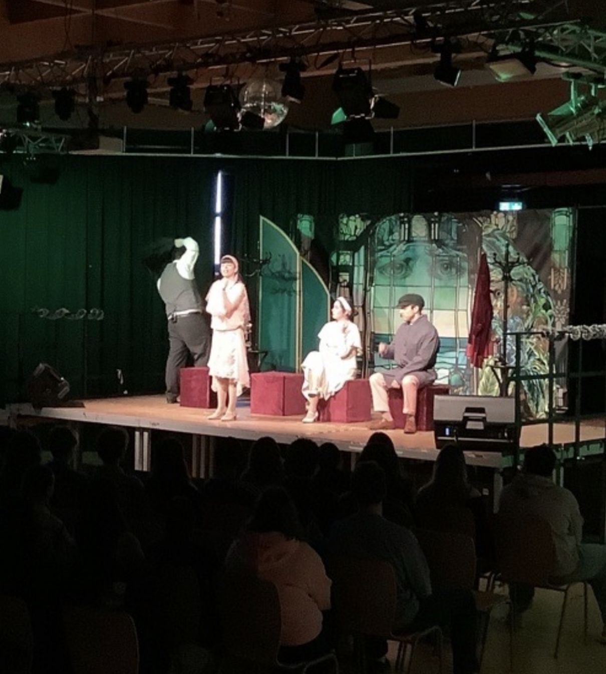 Anschließend tauchte die Q1 ein in die Geschichte des großen Gatsby, ins Amerika des Jazzzeitalters. Die Oberstufenschüler:innen verfolgten gebannt diese Geschichte um den amerikanischen Traum und Gatsbys Sehnsucht nach seiner Jugendliebe Daisy Buchanan und löcherten, ebenso wie die Kinder der Klassen 5 und 6 zuvor, die Schauspieler:innenam Ende mit vielen interessanten Fragen.